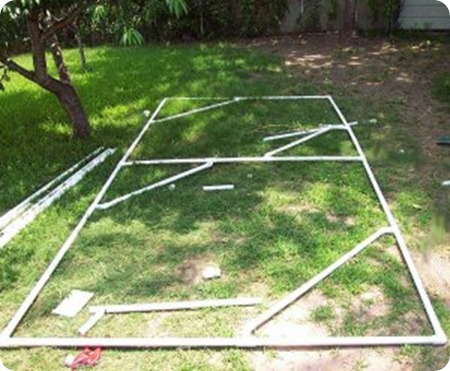 After determining the dimensions of the shade material, I began the layout of the frame work, in this case PVC pipe in a 1" diameter sizing it to allow 4-6" extra on all sides of the cloth. I choose this medium for the framework, for it's lightweight and strength.